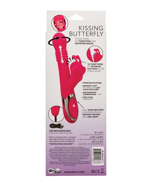 Each element works in harmony to deliver deep, pulsating rhythms that resonate through your entire body. Designed with precision, the Enchanted Kissing Butterfly features 4 functions of thrusting and rotating beads at the tip to enhance your internal sensations, while the 12 functions of intimate suction gently draw on your most sensitive areas, mimicking the tantalizing touch of a lovers lips. Crafted from body-safe silicone, this dual stimulator is not only smooth and comfortable but also 100% waterproof with an IPX7 rating, making it the perfect companion for adventurous play in or out of the water. This enchanting butterfly is as convenient as it is pleasurable. With easy push-button controls, an instant on/off button, and an LED light for clear operation, it offers effortless enjoyment. USB rechargeable and efficient, a complete charge takes only 1.5 hours, providing 40 minutes of low-speed delight or 30 minutes on a high-intensity setting. Let the Enchanted Kissing Butterfly lead you into a world of indulgent stimulation and breathtaking satisfaction.