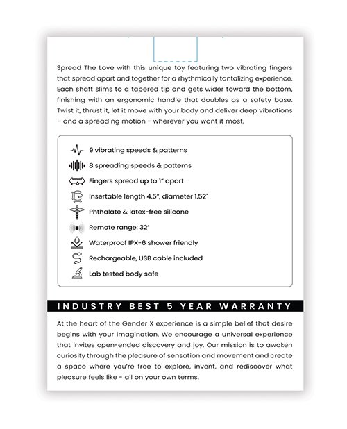 | specifications | 9 vibrating speeds & patterns 8 spreading speeds & patterns Fingers spread up to 1 apart Insertable length 4.5, diameter 1.52" Phthalate & latex-free silicone Remote range: 32 Waterproof IPX-6 shower friendly Rechargeable, USB cable included Lab tested body safe |