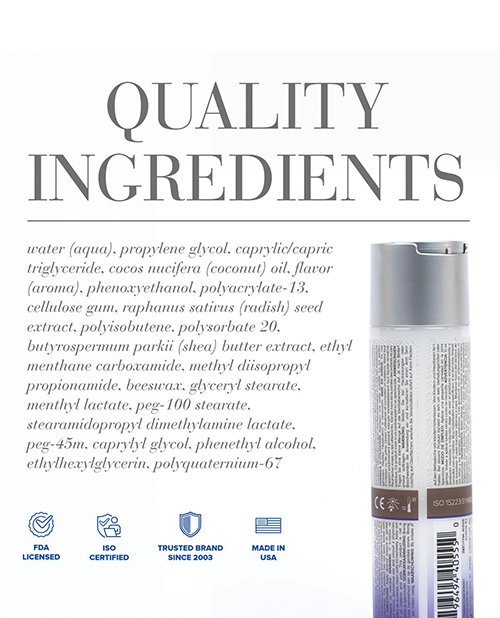 It offers a rich glide that melts against the skin for the perfect slide during solo, partnered, and toy play. Its soft, creamy formula absorbs naturally for a nourishing and delicate finish thats never greasy or oily. Key ingredients. Cocos Nucifera (Coconut) Oil is a natural antioxidant and moisturizer. Not compatible with polyurethane condoms. Methyl Lactate delivers a quick-acting cooling/tingling sensation. Not compatible with polyurethane condoms.