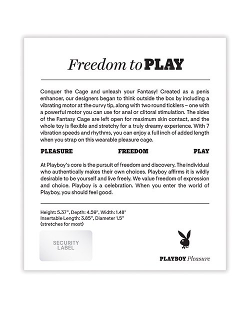 Conquer the Cage and unleash your Fantasy! Created as a penis enhancer, our designers began to think outside the box by including a vibrating motor at the curvy tip, along with two round ticklers one with a powerful motor you can use for anal or clitoral stimulation. The sides of the Fantasy Cage are left open for maximum skin contact, and the whole toy is flexible and stretchy for a truly dreamy experience. With 7 vibration speeds and rhythms, you can enjoy a full inch of added length when you strap on this wearable pleasure cage. Five Year Warranty.